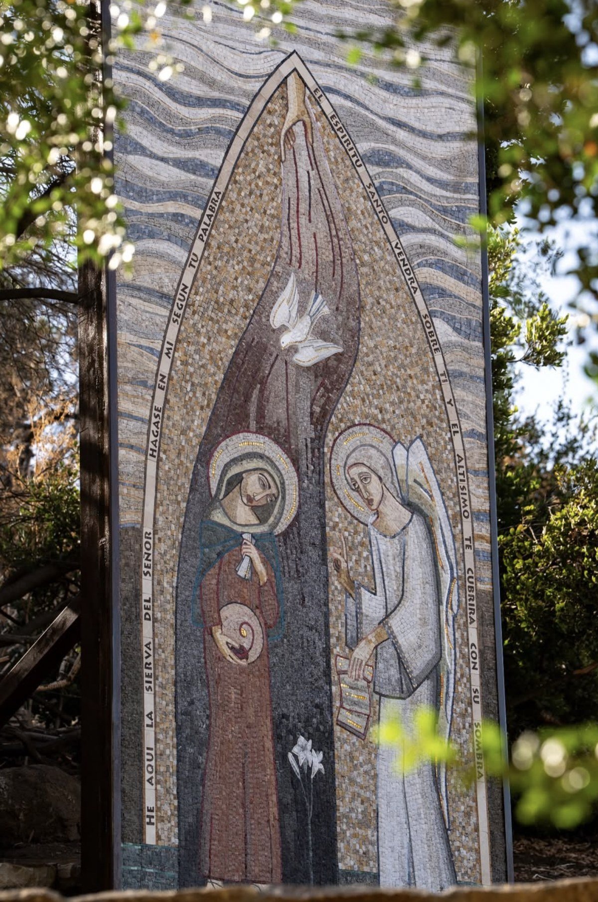 “El ángel entró en el silencio de María. Toda esta escena es silencio, intimidad y armonía. ¿Es posible pintar el silencio? La gracia del mosaico es que está hecho de piedras, cada una contiene mil colores y estas fueron ordenadas por luces y sombras, dibujo y color. El dibujo nos habla del evangelio, el color evoca a la emoción. La luz de la sombra es la presencia del Espíritu Santo y sus siete dones, quien permite la venida del Hijo de Dios al vientre de María. Entonces, el verdadero silencio, más que ausencia de palabras, es presencia de Dios. Cada piedra del mosaico es obra de Él. Dios es suave susurro, paz y armonía. Estas piedras creadas por nuestro Padre, recogidas por muchas personas en diversos cerros del mundo, fueron recreadas por Él en una imagen plasmada en el silencio de esta montaña. Fundidas en esta Anunciación, vienen a regalarnos un silencio que es paz interior, armonía serena, apertura gozosa hacia lo alto, un silencio que si queremos vivenciar nos dejará vía libre al Señor”.